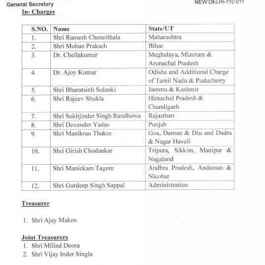 पार्टी ने वरिष्ठ नेता मुकुल वासनिक को गुजरात का प्रभार सौंपा है. रणदीप सिंह सुरजेवाला को कर्नाटक का प्रभारी नियुक्त किया गया है. जयराम रमेश को संचार प्रभारी महासचिव नियुक्त किया गया है. केसी वेणुगोपाल संगठन के प्रभारी महासचिव की भूमिका निभाएंगे. प्रियंका गांधी को कोई विभाग नहीं सौंपा गया है.