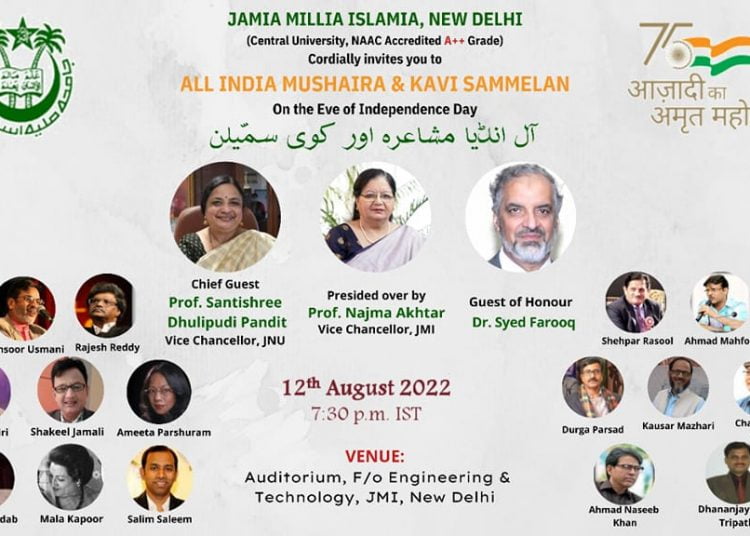 AKAM के हिस्से के रूप में, एक ‘अखिल भारतीय मुशायरा और कवि सम्मेलन’ भी आज विश्वविद्यालय द्वारा स्वतंत्रता दिवस की पूर्व संध्या पर आयोजित किया जा रहा है। प्रो. शांतिश्री धूलिपुडी पंडित, कुलपति, जेएनयू समारोह के मुख्य अतिथि होंगे और इसकी अध्यक्षता जामिया की कुलपति प्रो नजमा अख्तर करेंगी। कार्यक्रम के विशिष्ट अतिथि डॉ. सैयद फारूक होंगे।