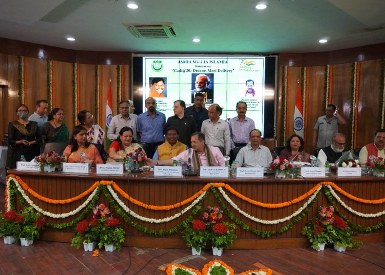 जामिया मिल्लिया इस्लामिया के इंजीनियरिंग एंड टेक्नोलॉजी के ऑडिटोरियम में आज ‘मोदी@20: ड्रीम्स मीट डिलीवरी’ पुस्तक पर एक संगोष्ठी का आयोजन किया गया। श्री अर्जुन मुंडा, माननीय केंद्रीय जनजातीय कार्य मंत्री, भारत सरकार समारोह के मुख्य अतिथि थे और श्री इंद्रेश कुमार मार्गदर्शी, मुस्लिम राष्ट्रीय मंच (एमआरएम) मुख्य वक्ता थे।