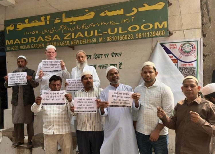नई दिल्ली:( प्रेस विज्ञप्ति)दक्षिण-पश्चिमी दिल्ली के मोहन गार्डन (विपिन गार्डन) कब्रिस्तान मामले में पूरा साल गुज़र जाने के बाद भी पुलिस द्वारा अभी तक एफआईआर दर्ज नहीं की गई है। जहां आज भी शरारती तत्व सांप्रदायिक सद्भाव को बिगाड़ने के लिए लगातार क़ब्रों को नुकसान पहुंचा रहे हैं। जिनके खि़लाफ़ ‘मुस्लिम कल्चरल सोसायटी उत्तम नगर‘ के पदाधिकारियों व इलाके की अवाम ने जुमे की नमाज़ के बाद शांतिपूर्ण विरोध प्रदर्शन किया।