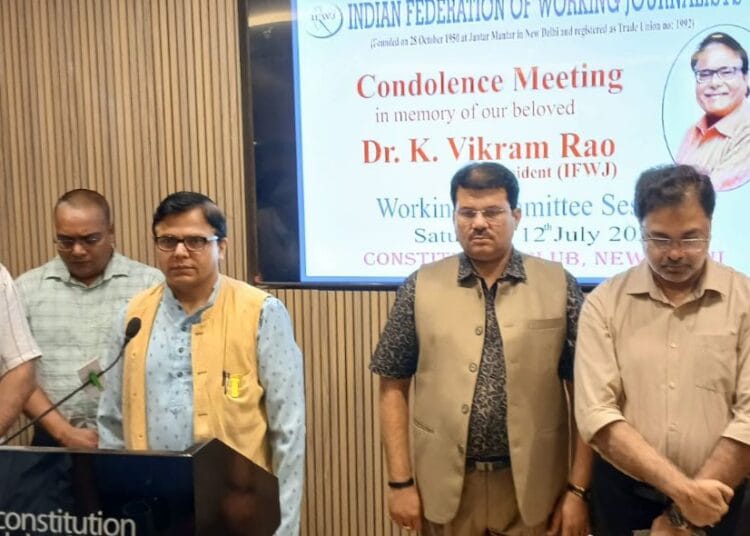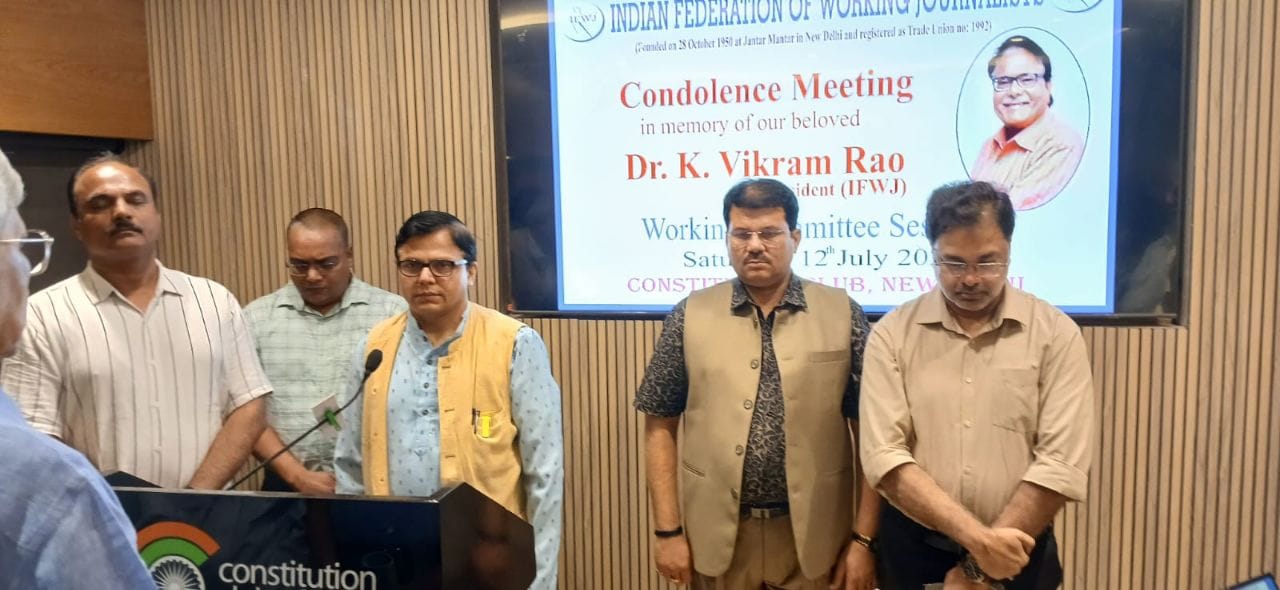 नई दिल्ली: 12 जुलाई: देश भर के पत्रकार, मीडिया शिक्षक, विभिन्न ट्रेड यूनियन संगठनों (पीटीआई कर्मचारी संघ, टाइम्स कर्मचारी संघ, समाचार पत्र कर्मचारी संघों का कंफेडेरशन, नेशनल फेडरेशन ऑफ न्यूजपेपर एम्प्लॉइज) के प्रतिनिधियों सहित, पत्रकार संघों के प्रतिनिधि और प्रेस कर्मचारियों के नेता 12 जुलाई 2025, शनिवार की सुबह नई दिल्ली के कॉन्स्टिट्यूशन क्लब में एकत्र हुए, ताकि पत्रकार और जन-नायक कामरेड के. विक्रम राव के निधन पर शोक व्यक्त कर सकें।